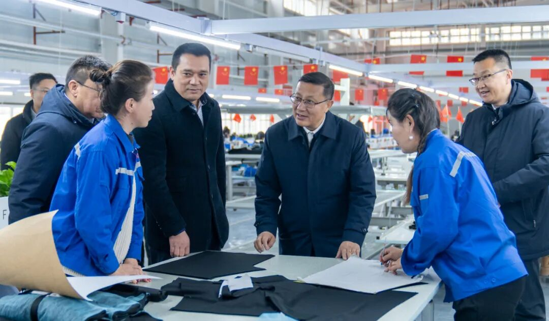 图为州委副书记、州长、州宣讲团副团长吾肉孜阿力·哈西哈尔巴依在阿合奇县克州中顺服装有限责任公司就学习贯彻党的二十届四中全会精神同企业职工进行互动交流。全媒体记者熊宣然摄