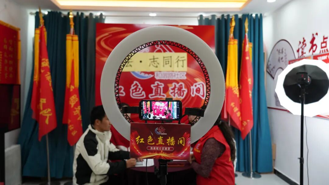 ▲图为志愿者普法小分队在和谐路社区“红色直播间”(抖音平台)开展普法直播。全媒体记者周禧玥摄