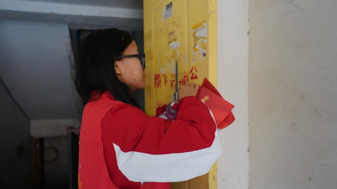 ▲图为志愿者正在清理社区墙面。全媒体记者周禧玥摄