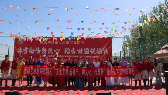 ▲图为新疆艺术剧院歌舞团“文化专家结对子、种文化、传帮带”服务队走进阿克陶镇开展巡回演出合影留念。