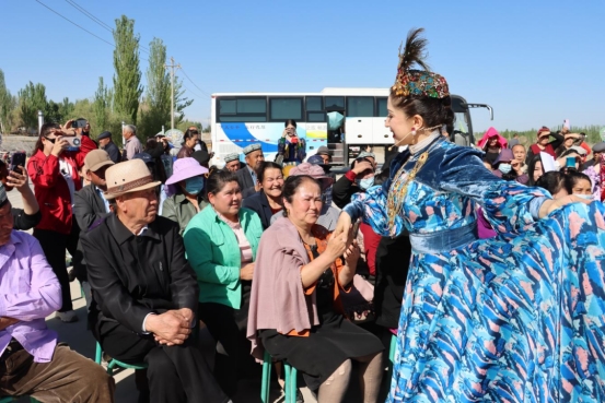 ▲图为新疆艺术剧院歌舞团演员与群众互动。