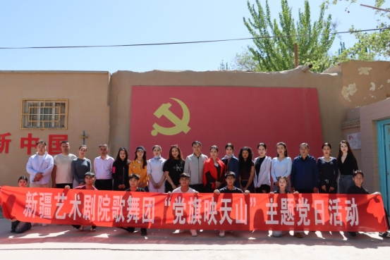 ▲图为新疆艺术剧院歌舞团服务队在诺库其艾日克村百年老居开展“党旗映天山”主题党日活动。