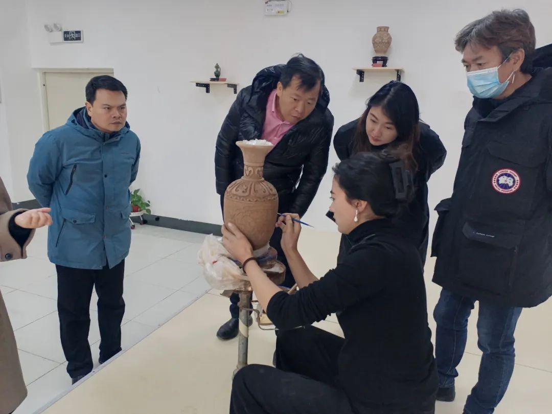 在阿克陶县米拉斯农民手工艺专业合作社产品创作和展区,合作社负责人奥布力塔力普·阿吉自豪地说:“前段时间刚从江西参加土陶培训回家乡,这次培训使我的制陶理念、创意和技术有了很大的进步,我们的土陶艺因它粗犷的线条、独特的花纹深受人们喜爱,合作社的土陶艺销往全国各地。考察团企业家们就如何在现有的技术工艺上利用现代手段进行拓展市场、传承古法技艺以及创作特色图案进行了深度交流,并就培养一批有特色的陶工队伍一同创作和发扬光大传承古法技艺的做法,给予了赞许。”