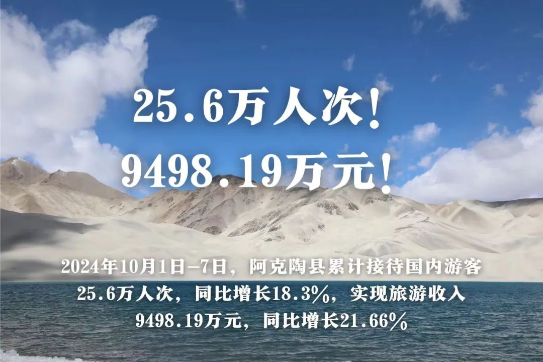 记者从阿克陶县文化体育广播电视和旅游局获悉,2024年10月1日-7日,阿克陶县累计接待国内游客25.6万人次,实现旅游收入9498.19万元,分别同比增长18.3%、21.66%。