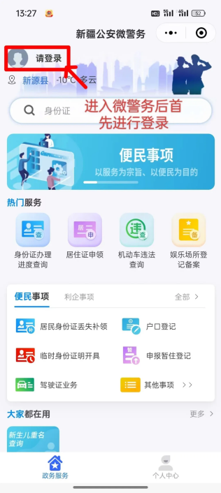 第二步:在小程序“政务服务”页面上方点击“请登录”,进行登录