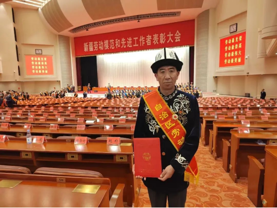 图为4月30日,麦麦提努尔·吾布力艾山参加新疆劳动模范和先进工作者表彰大会。