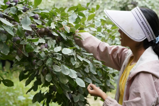 ▲图为员工正在采摘西梅。全媒体记者徐安芬摄