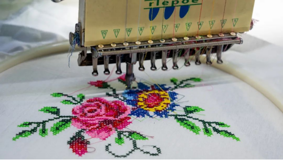 ▲图为刺绣机正在白色绣布上,绣织多彩花卉图案,展现独特工艺。全媒体记者麦合木提·阿卜拉摄