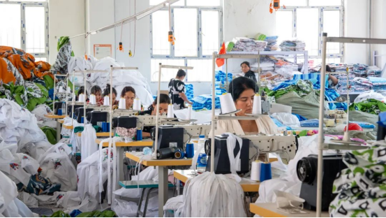 ▲图为员工们脚踩踏板,双手移动布料,熟练地操作缝纫机。全媒体记者麦合木提·阿卜拉摄