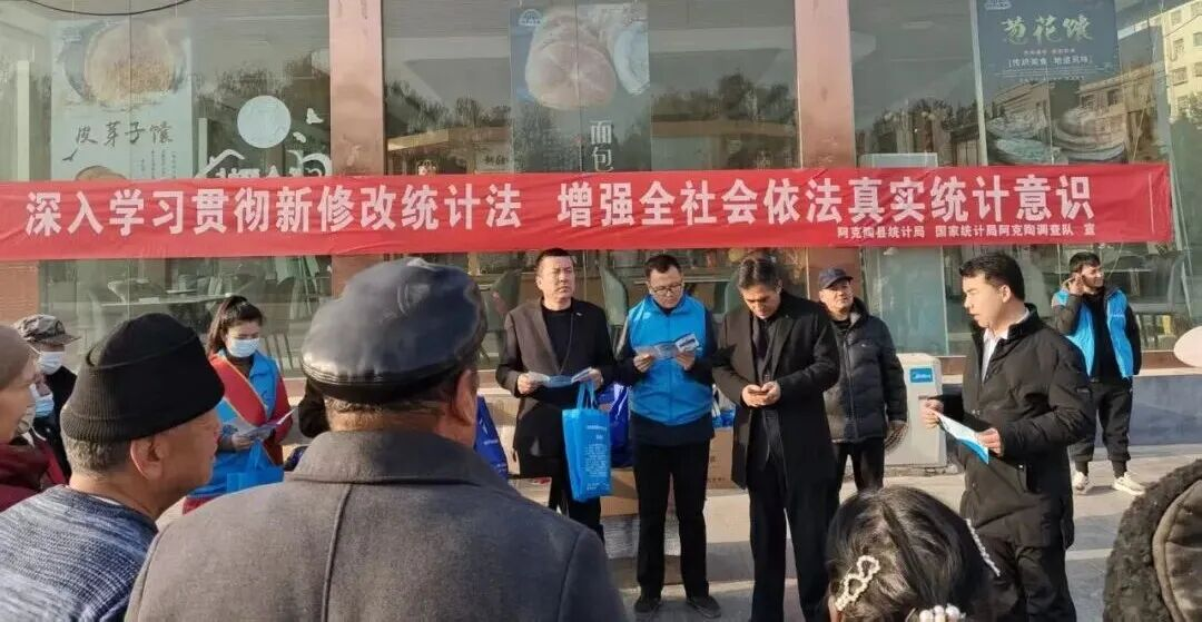 为深入贯彻落实法治宣传教育,深入践行习近平法治思想,全面推进新修改的《中华人民共和国统计法》。12月8日,在统计法颁布纪念日之际,阿克陶县统计局联合国家统计局阿克陶调查队开展以“深入学习新修订统计法,增强全社会依法真实统计意识”为主题的统计法律法规宣传活动。活动通过在阿克陶县人民广场定点宣传与深入4家企业及多家个体工商户上门宣传相结合的方式,切实提升全民统计法治意识。