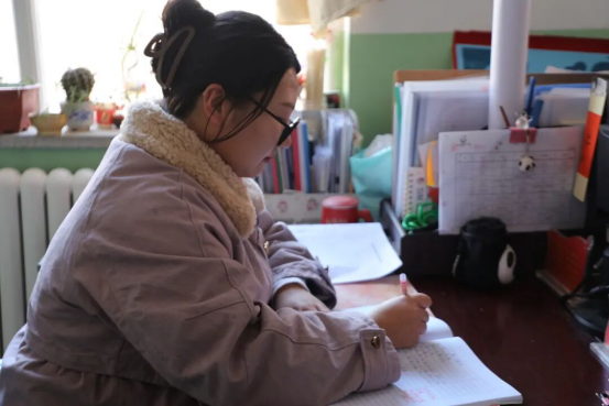 ▲图为范佳月在办公室写教案。全媒体记者阿依妮萨罕·麦麦提吾西尔摄