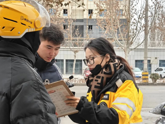 随后,骑手们迅速投入工作,“外卖新兵”们也同步转换角色,跟随老骑手穿行街巷,坐上配送车全程体验接单、取餐、送餐的完整流程。寒风裹挟细雪,“外卖新兵”们在争分夺秒的奔波中,真切体会到骑手们顶风冒雪的日常艰辛。一路并肩协作中,老骑手指点着老城区里没有电梯的楼栋、午高峰时混乱拥堵的校门口、地图定位模糊的隐秘小巷,让“外卖新兵”们直观感受到“最后一公里”配送中爬楼耗时、寻址费神等具体困扰。深入交流时,骑手们更是道出心中忧虑:商业保险往往只保交通事故,自身摔伤、中暑,或因顾客退单导致的损失却难有保障;理赔材料繁琐、周期长,耽误跑单;恶劣天气补贴时常“悬空”,平台规则变动也缺乏协商渠道。这些来自一线的、带着寒气与汗水的具体声音,让县委社会工作部干部们从“办公室”真正走到了“配送路”上,在“换位”中感知冷暖,于“体验”中触摸到新就业群体权益保障在险种覆盖、理赔效率、规则透明度等方面的真实“堵点”。大家不仅深切感受到骑手们的坚守与付出,也为后续如何精准优化服务、完善行业治理,积累带着温度的素材。