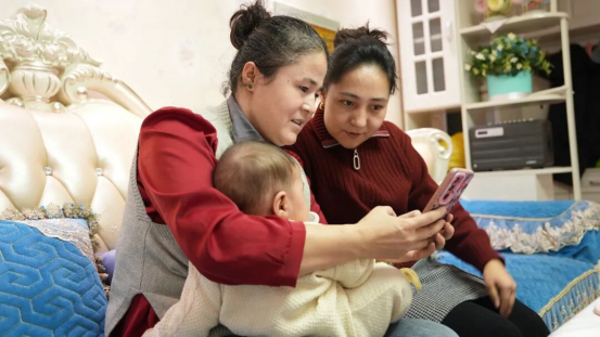 ▲图为古再丽努尔·艾尔肯正在给朋友分享领取补贴后的喜悦。全媒体记者麦合木提·阿卜拉摄