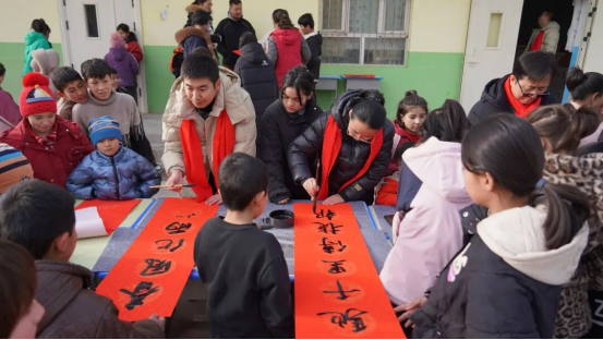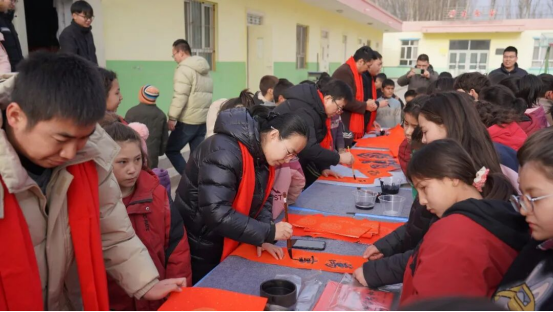 活动现场暖意融融,书法爱好者们精神饱满,执笔蘸墨、挥毫泼洒,楷体的端庄、行书的灵动,在笔锋流转间尽显书法艺术之美。一个个圆润饱满的“福”字,一副副对仗工整的春联跃然纸上,“勤学笃行追梦想,平安喜乐迎新春”等作品,既承载着新春的美好祈愿,也寄托着对乡村学子成长成才的殷切期盼。