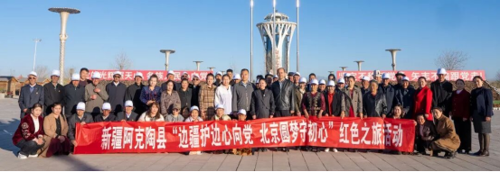 ▲图为“边疆护边心向党北京圆梦守初心”红色之旅活动出发时党员们和家属的合影。全媒体记者麦合木提·阿卜拉摄