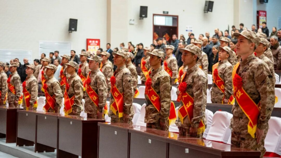 欢送仪式在庄严的国歌声中拉开帷幕。现场气氛热烈而庄重,新兵们身着戎装、胸佩红花、肩披“光荣入伍”绶带,精神抖擞、英姿勃发,展现出新时代青年积极响应祖国号召、矢志军营的豪情与担当。