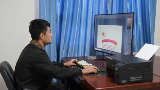 ▲图为村干部加帕尔·玉素甫正在定制带有阿克陶本地元素的文创纸杯。全媒体记者王紫卓摄