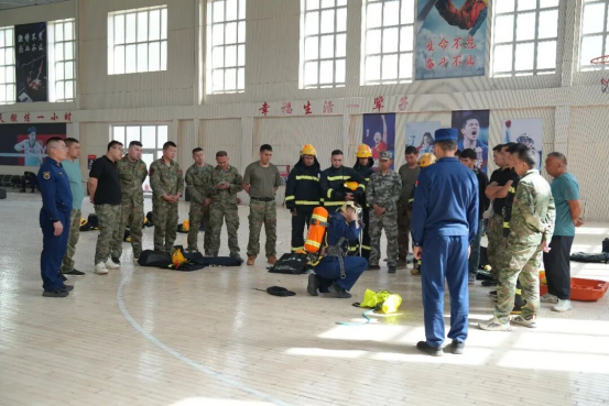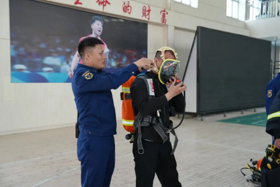 ▲图为教官为学员讲解空气呼吸器的佩戴方法的场景。