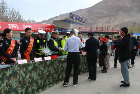4月16日,由新疆维吾尔自治区司法厅、公安厅、文化和旅游厅、新疆出入境边防检查总站及克州司法局联合主办的“万里边关普法行”系列实地普法宣传活动,在阿克陶县盖孜边境检查站火热举行。