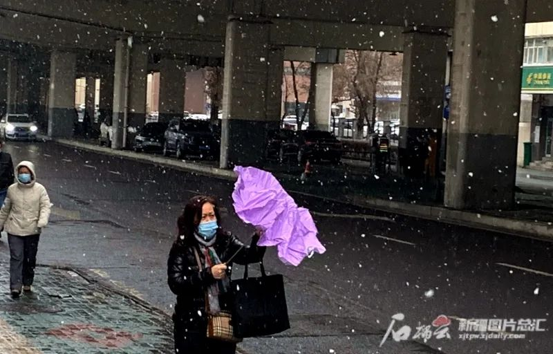3月18日16时8分,乌鲁木齐市五星路,天空雪花纷飞,一位行人拿出雨伞遮雪。石榴云/新疆日报记者王琦铭摄