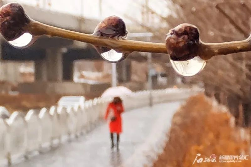 3月16日9时50分,乌鲁木齐市温泉东路旁一树枝上挂着雨珠。石榴云/新疆日报记者秦鹏摄