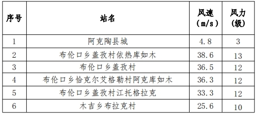 表:12月12日08时至13日08时县城及部分乡镇站点极大风力≥8级实况表