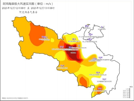 图1:12月12日08时至13日08时县城及部分乡镇站点极大风速实况图