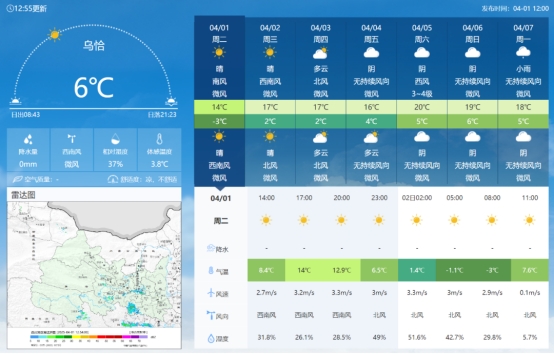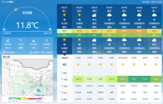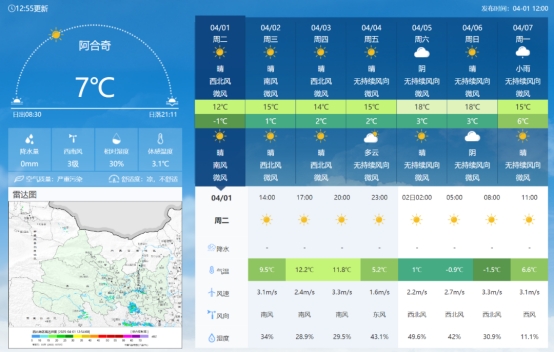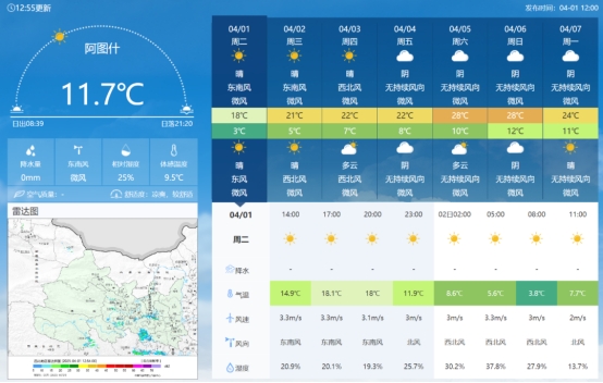 预计4月1日,我州大部晴间多云,平原及浅山区有浮尘,午后至夜间,阿合奇县大部断续有微到小雨或雪,阵风4级左右。