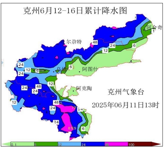 根据最新气象资料分析,预计6月12~16日,我县将进入新一轮多降水时段,山区局地将出现暴雨(高海拔山区雨转雨夹雪或雪),克孜勒陶镇至塔尔乡一带累积降水量最大可达50~80毫米。具体预报如下: