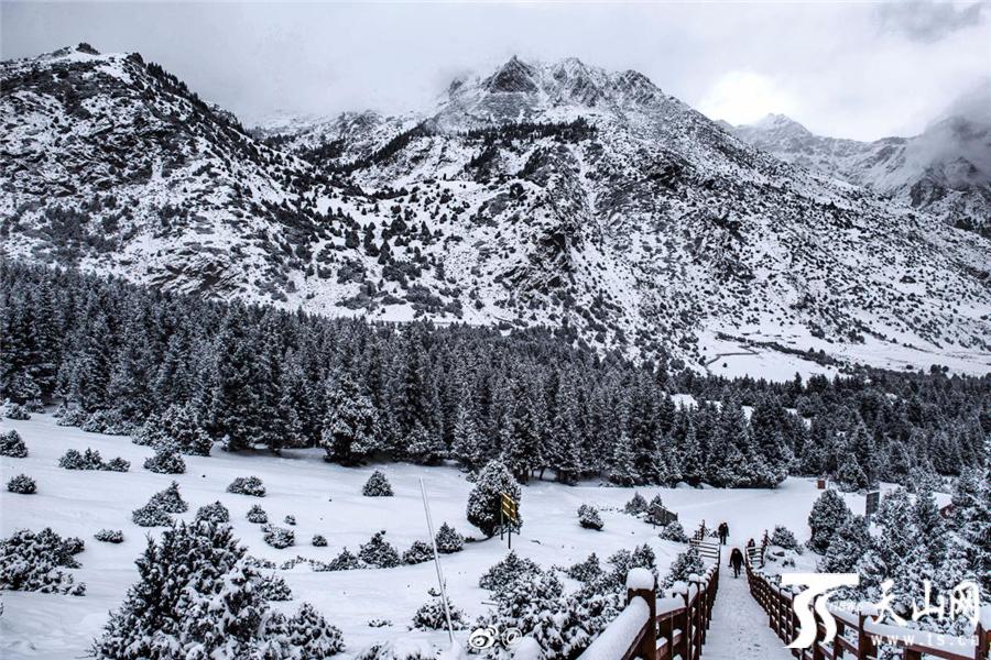 “三面环山,雪峰险峻,冰川纵横,林木茂密。银冬里的冰川公园,全都被皑皑白雪覆盖,少了其他季节的绚烂色彩和繁复细节,大自然展现出来的是不同层次的黑白灰影调。冬日南疆雪景让我仿佛身处中国山水画之中,轻描淡写却大气磅礴。”从他的文字中就能看出南疆雪景给他带来的惊艳。