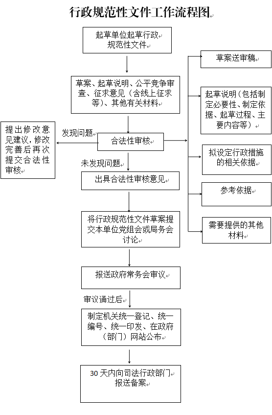 内部审核:起草部门完成起草工作后,应当将行政规范性文件草案送本部门法制工作机构进行合法性审核。法制工作机构主要从以下方面进行审核:是否超越制定机关的法定权限;是否符合宪法、法律、法规、规章和国家政策及上级行政规范性文件规定;是否违反法定程序;是否存在不合理的内容;其他需要审核的内容。