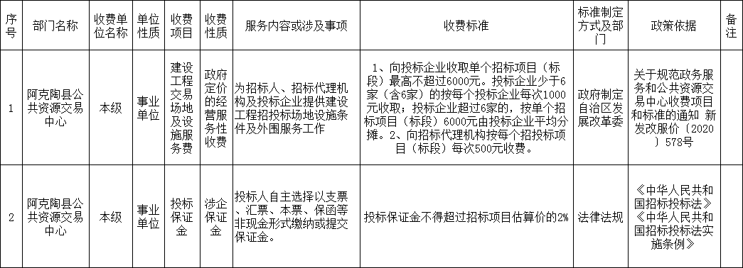 阿克陶县公共资源交易中心综合性涉企收费目录清单