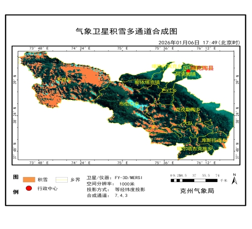 2026年1月6日FY3D/MERSI卫星积雪监测表明(图1):目前,我县积雪面积为4128.67平方公里。积雪主要集中在我县木吉乡、布伦口乡、克孜勒陶镇等高海拔山区。