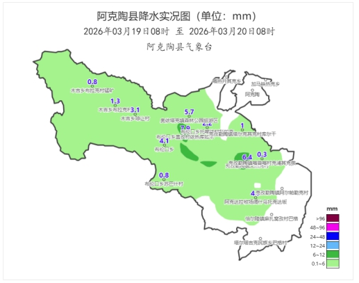 3月1908时至2008时日,全县共有20站出现有量降水(0.1~7.9毫米),降水量最大值出现在布伦口乡盖孜村依热库如木站为7.9毫米(中到大雪)。