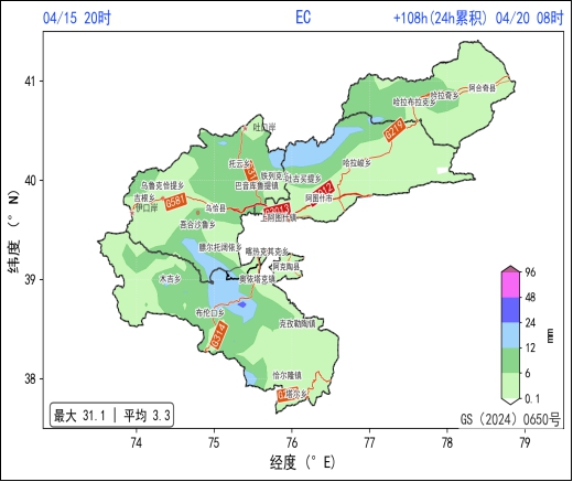 降水过程累计量:克孜勒陶镇、恰尔隆镇至塔尔乡一带累计降雨量可达10~20毫米;布伦口乡至奥依塔克镇一带累计降雨量可达20~30毫米。
