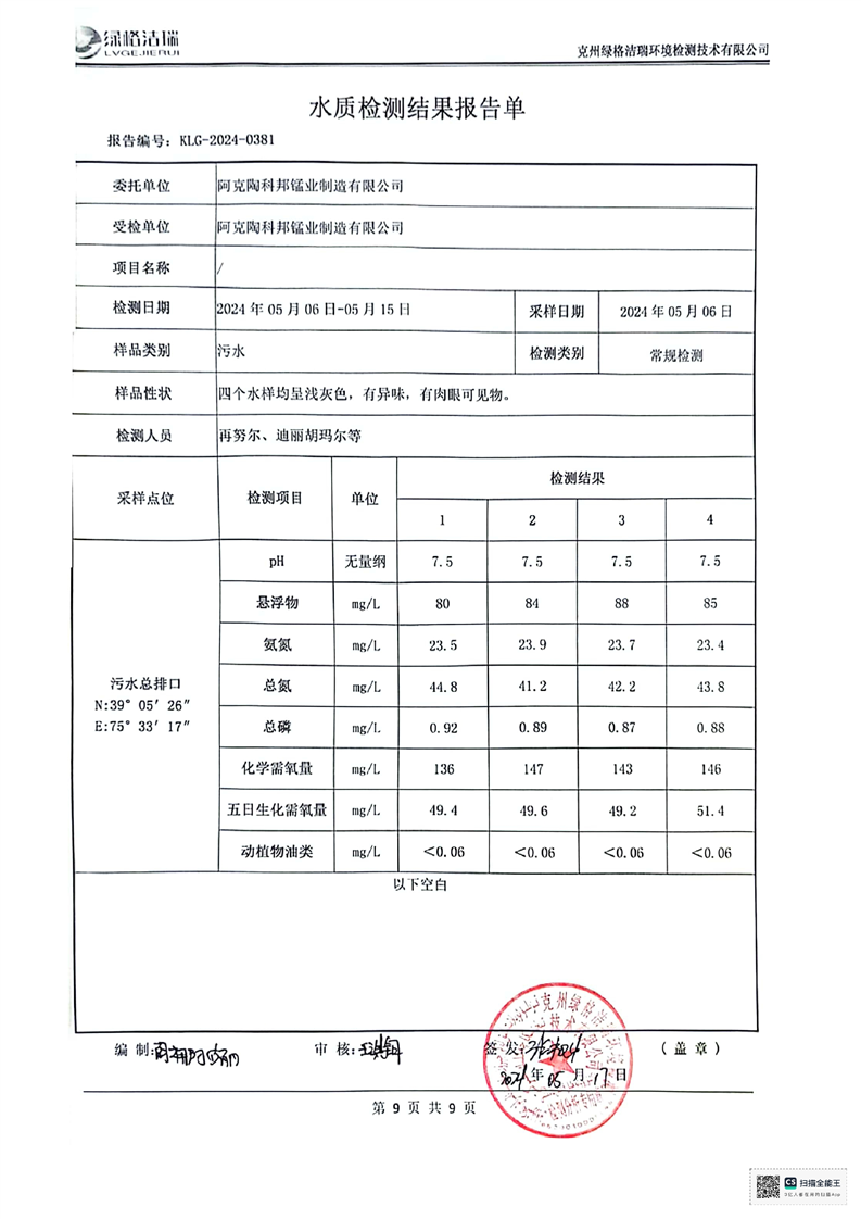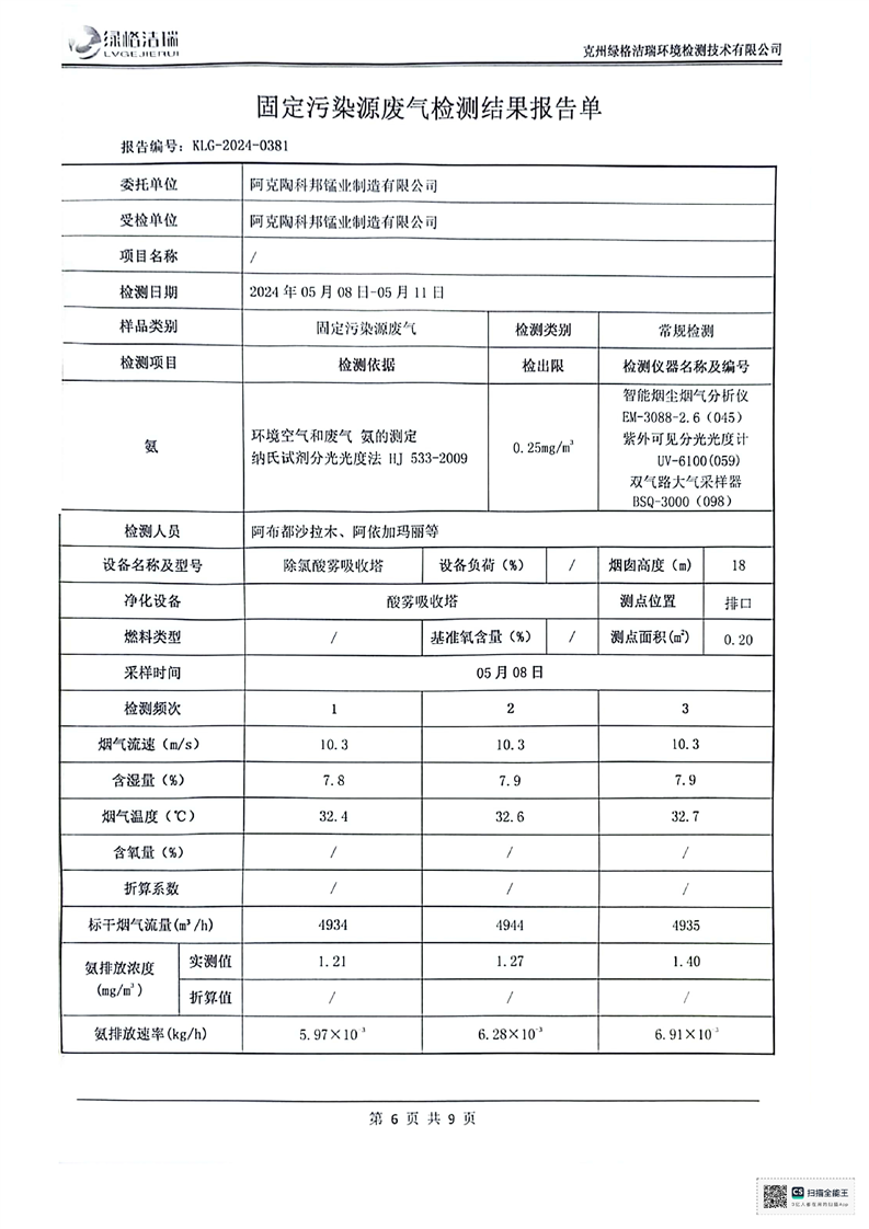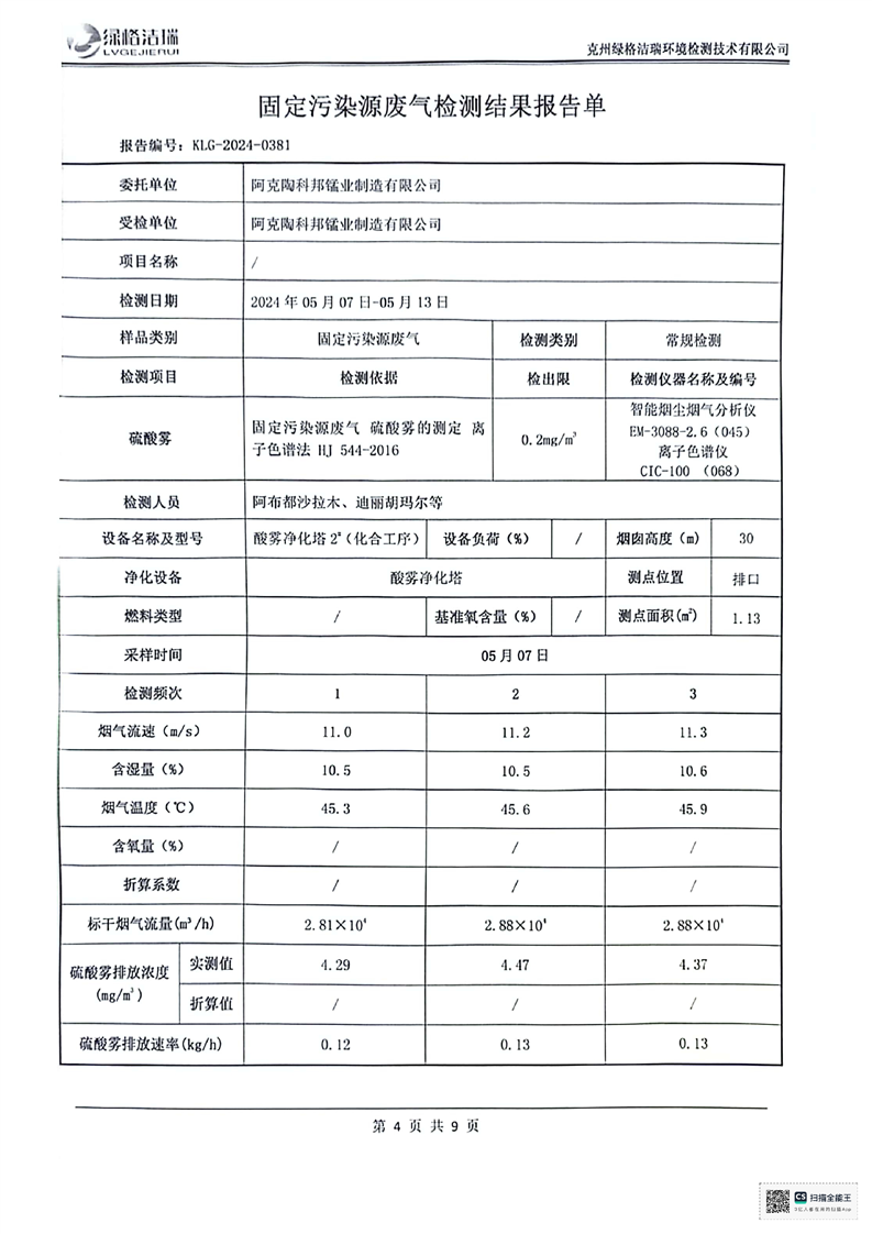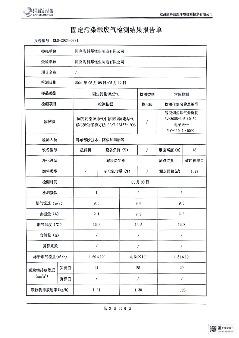 阿克陶科邦锰业制造有限公司2024年5月份污染源情况