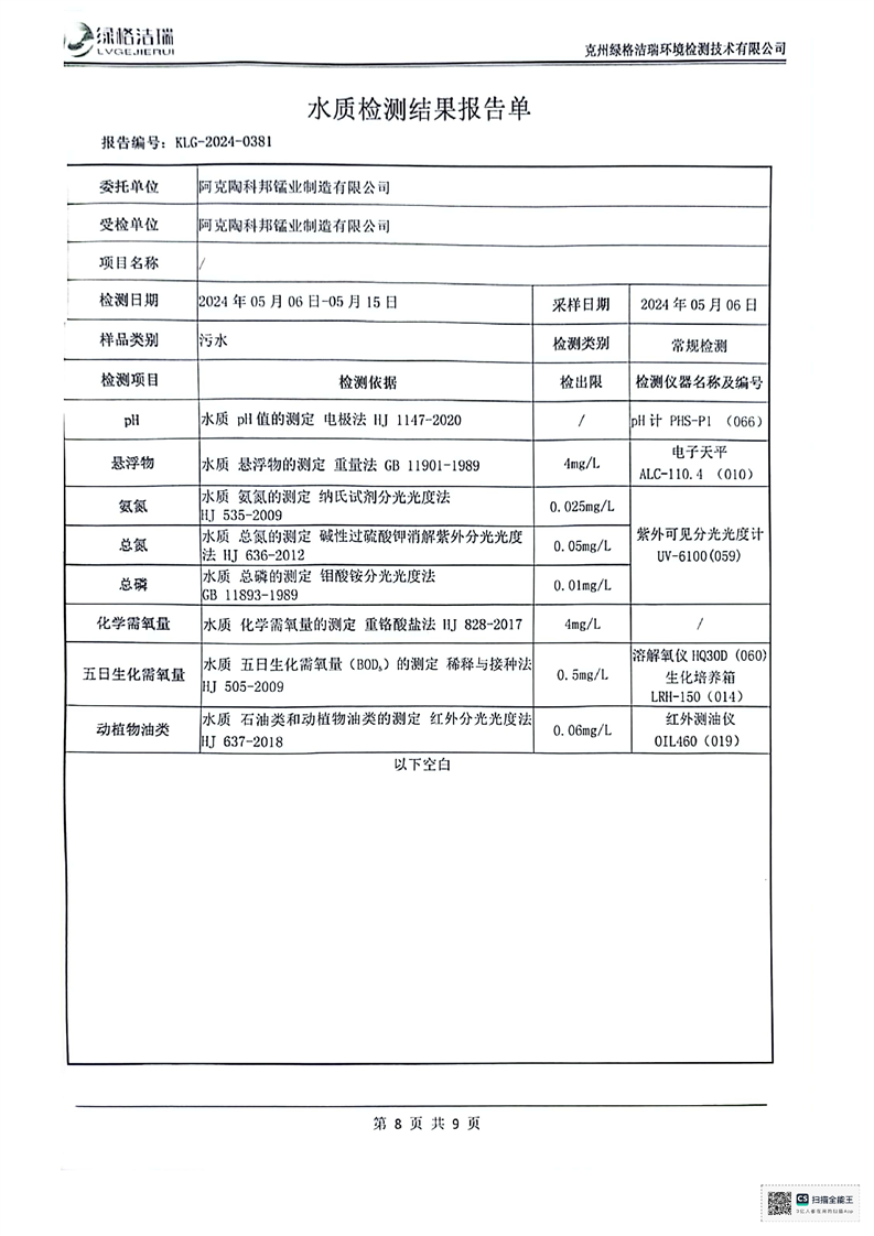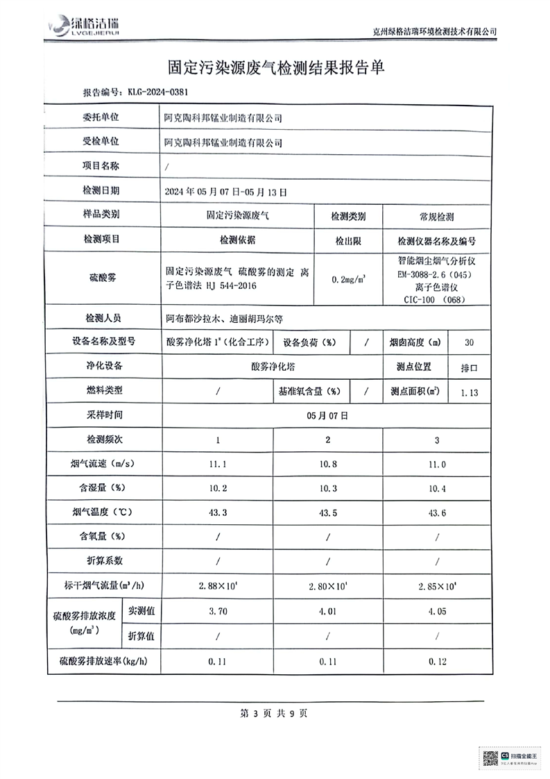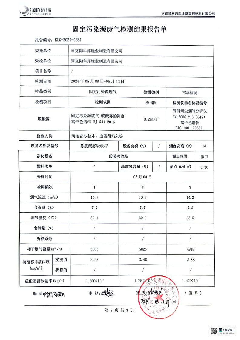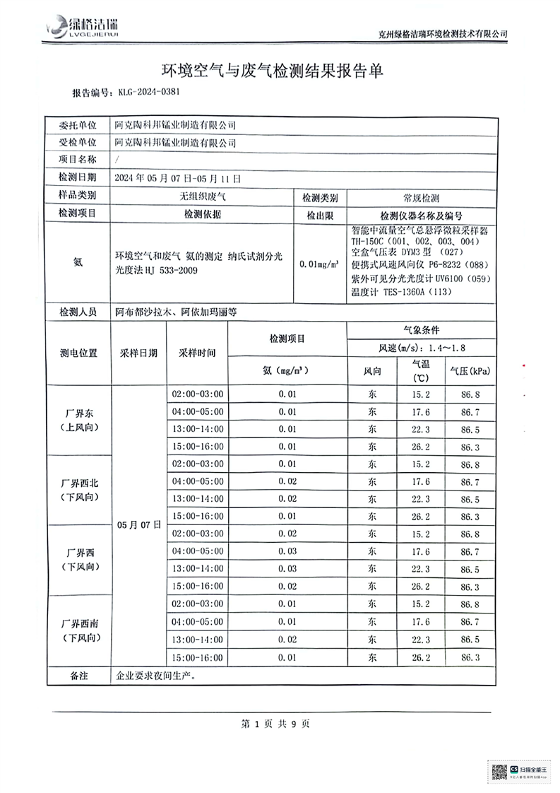 阿克陶科邦锰业制造有限公司2024年5月份污染源情况