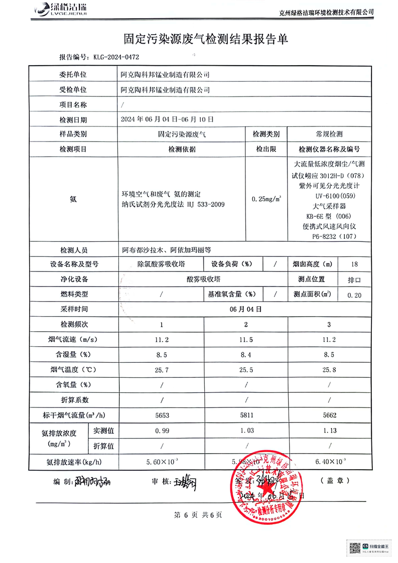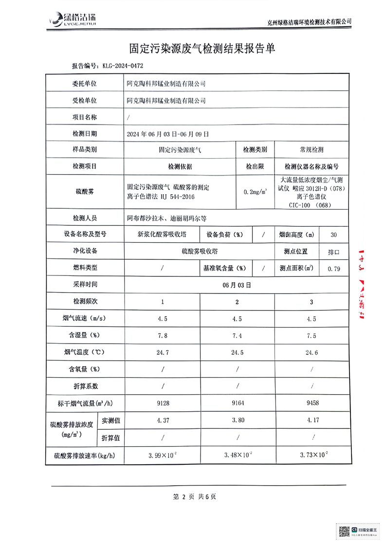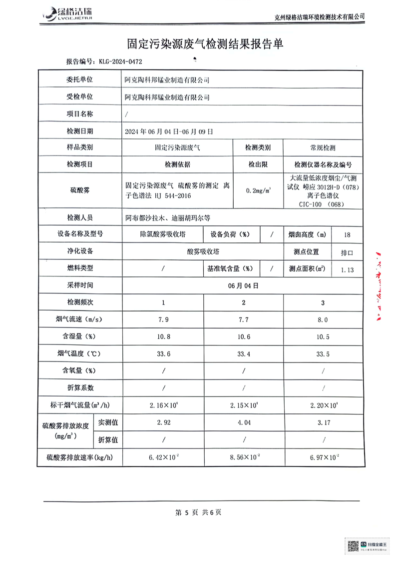 阿克陶科邦锰业制造有限公司2024年6月份污染源情