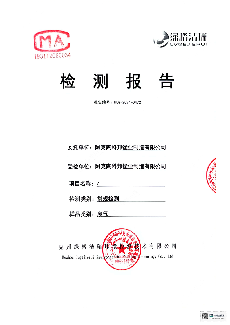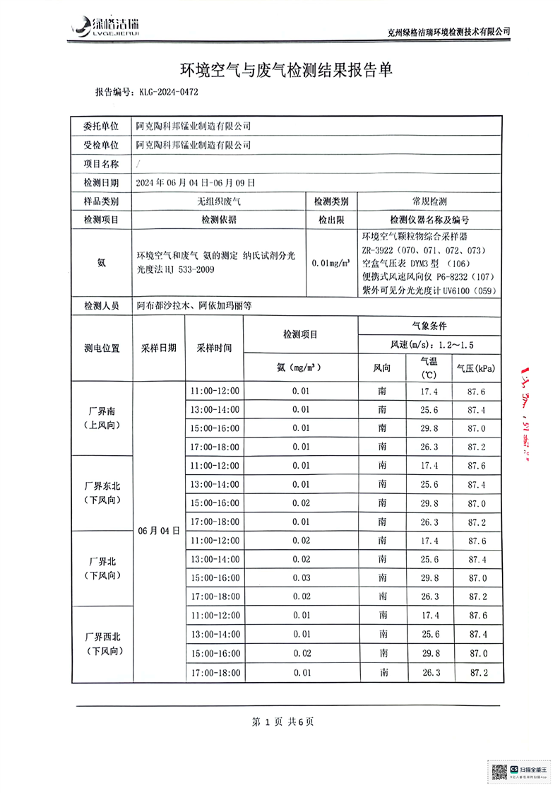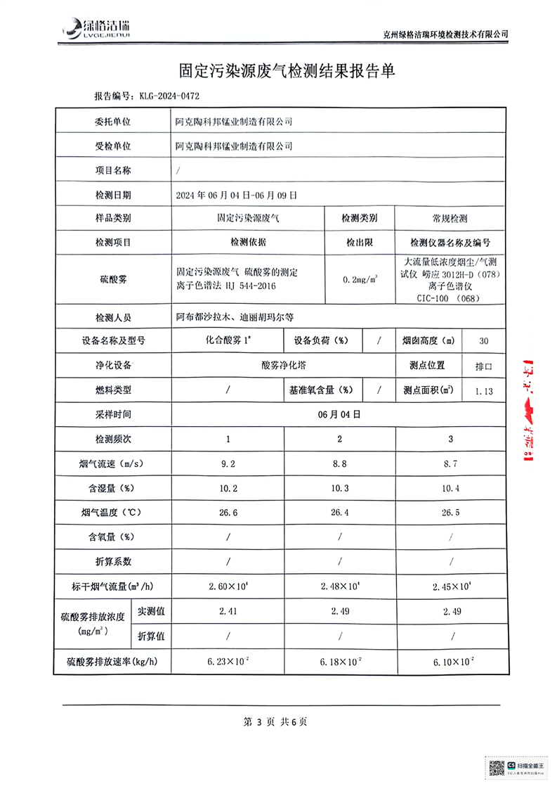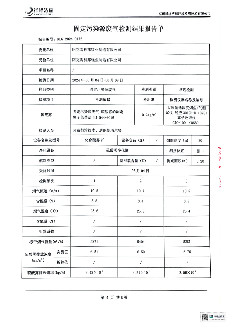 阿克陶科邦锰业制造有限公司2024年6月份污染源情
