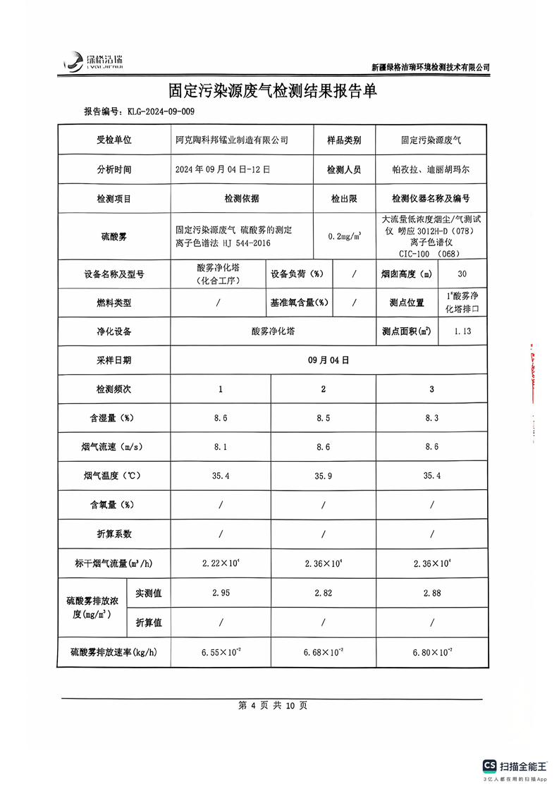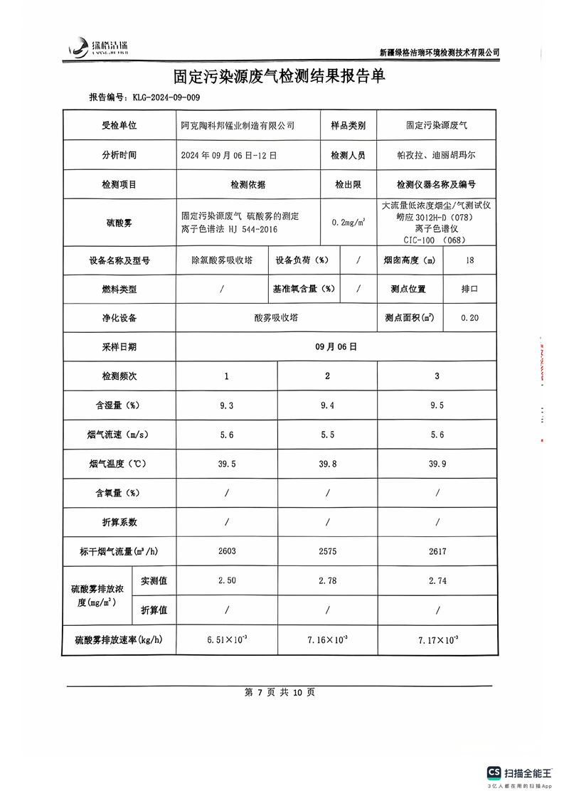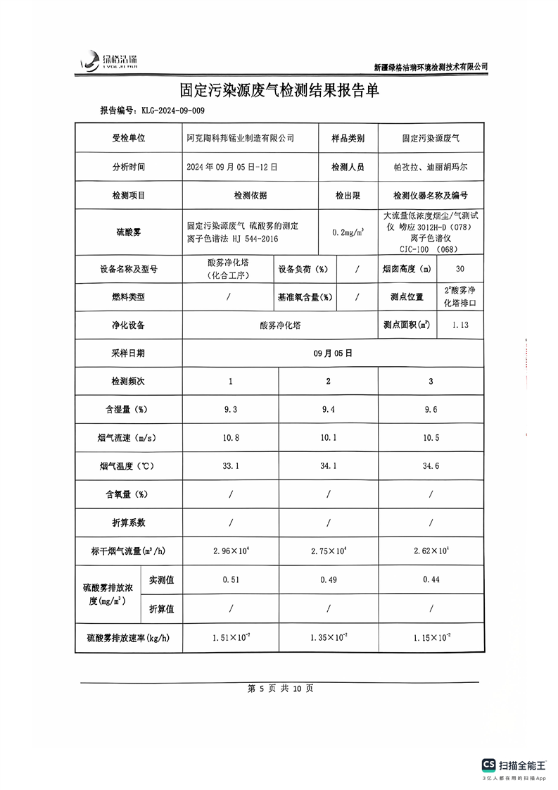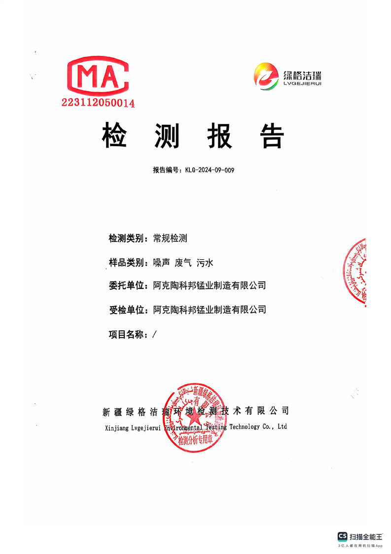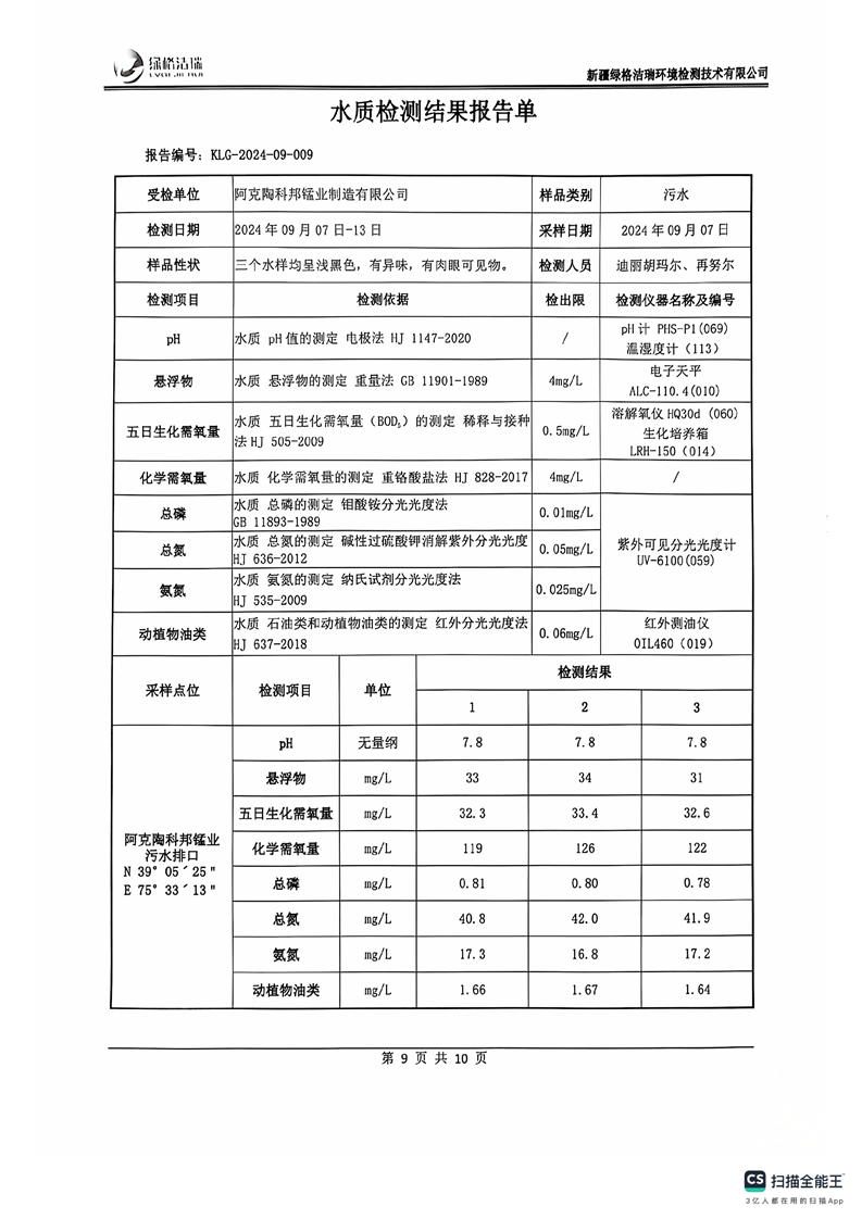 阿克陶科邦锰业制造有限公司2024年9月份污染源情况