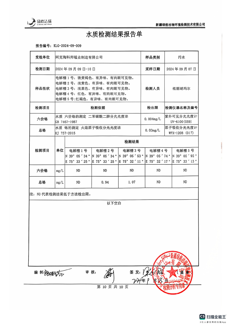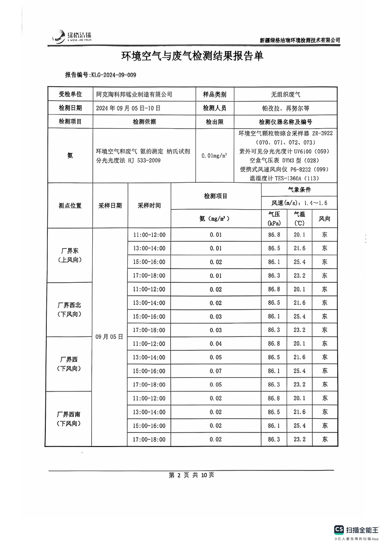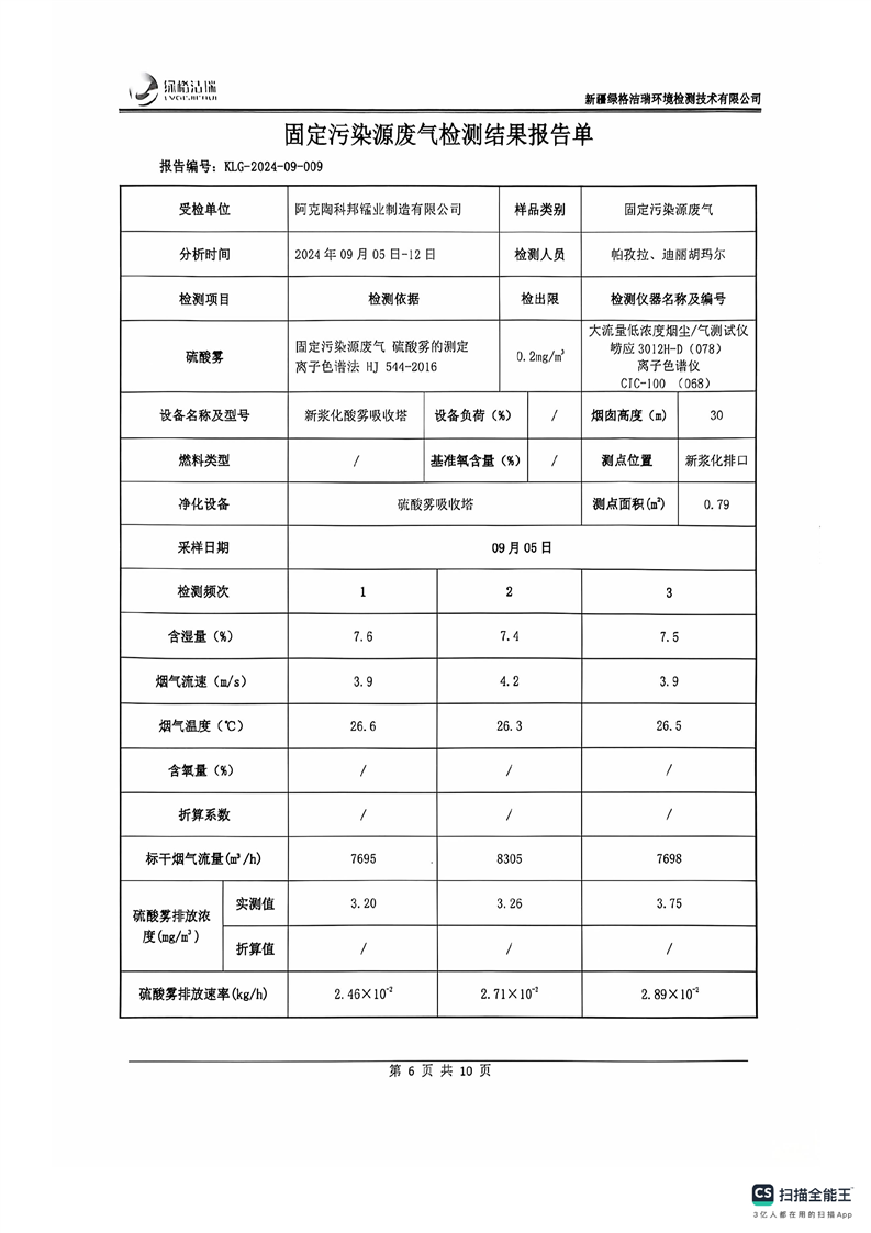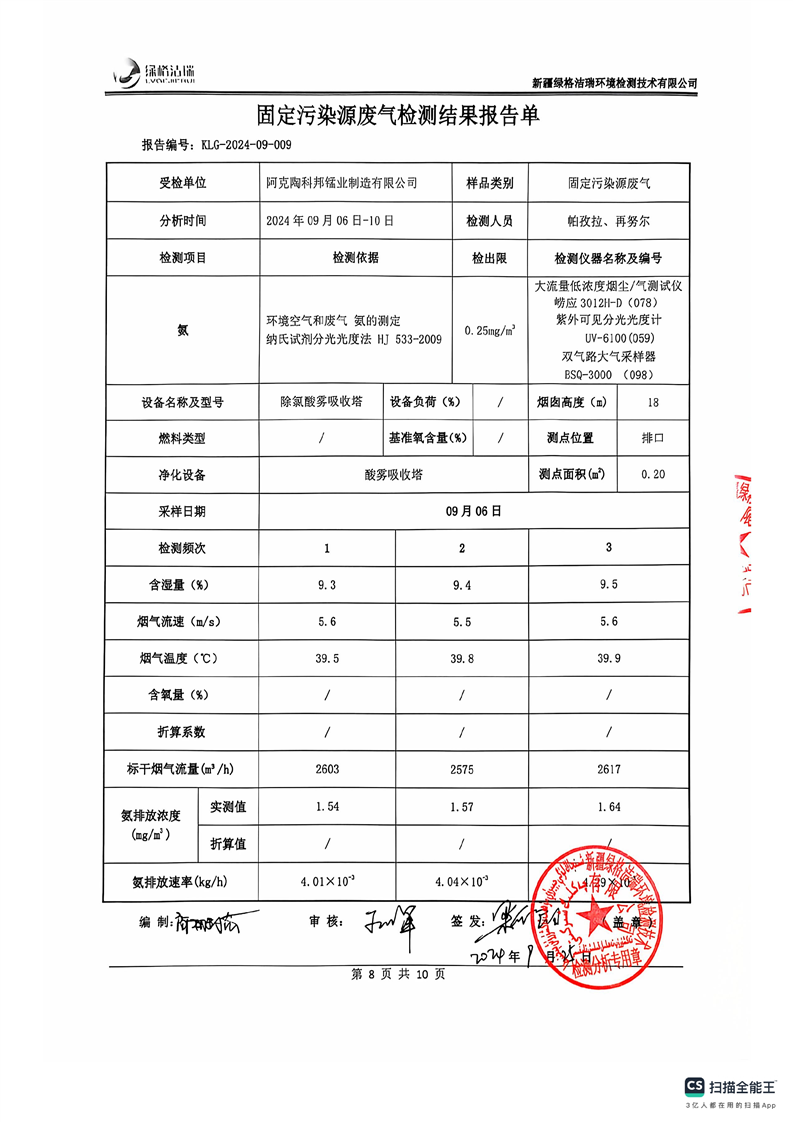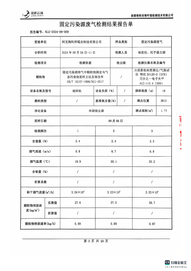 阿克陶科邦锰业制造有限公司2024年9月份污染源情况