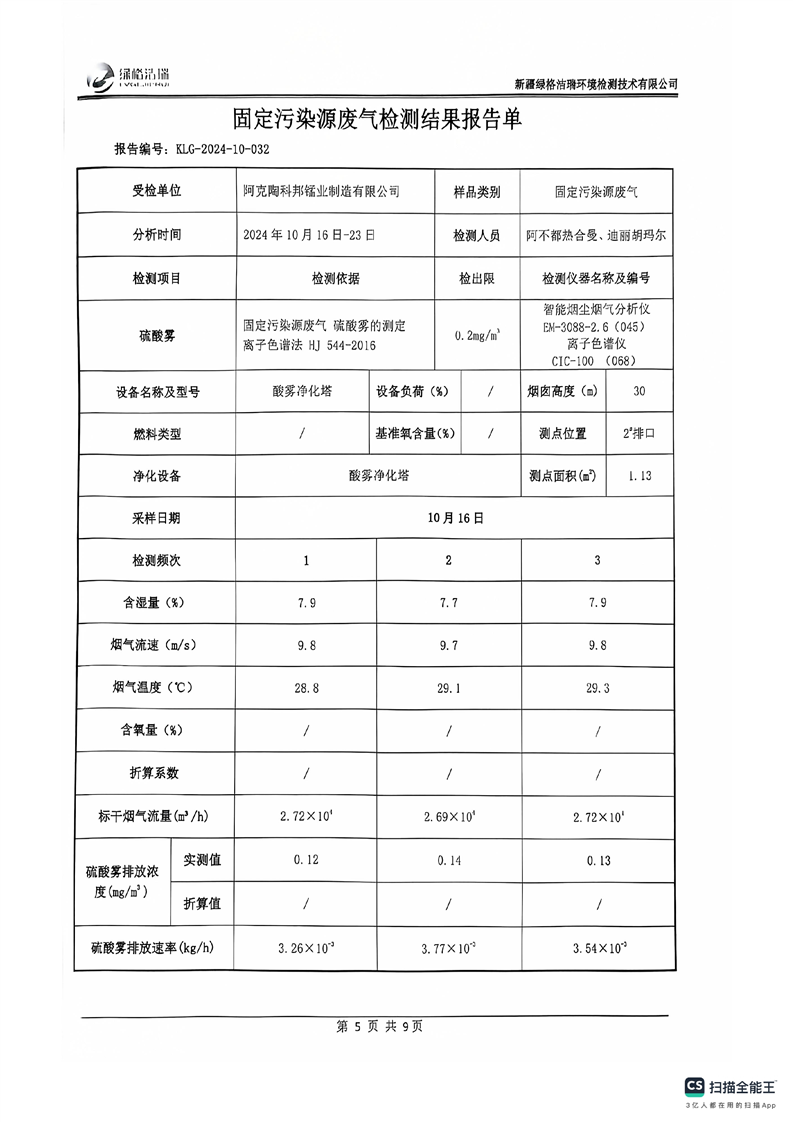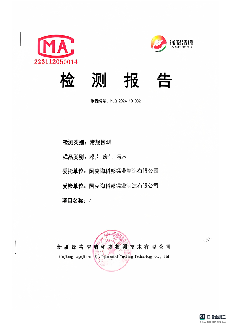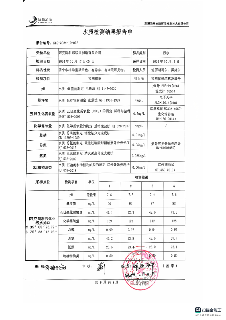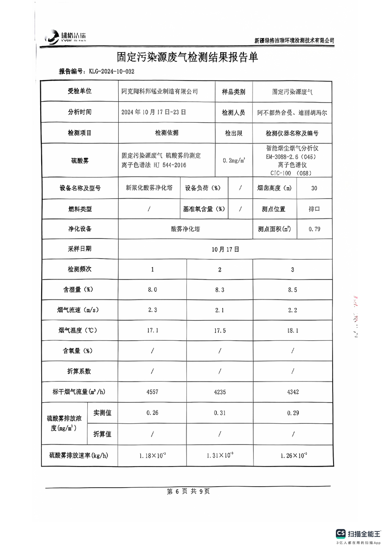 阿克陶科邦锰业制造有限公司2024年10月份污染源情况