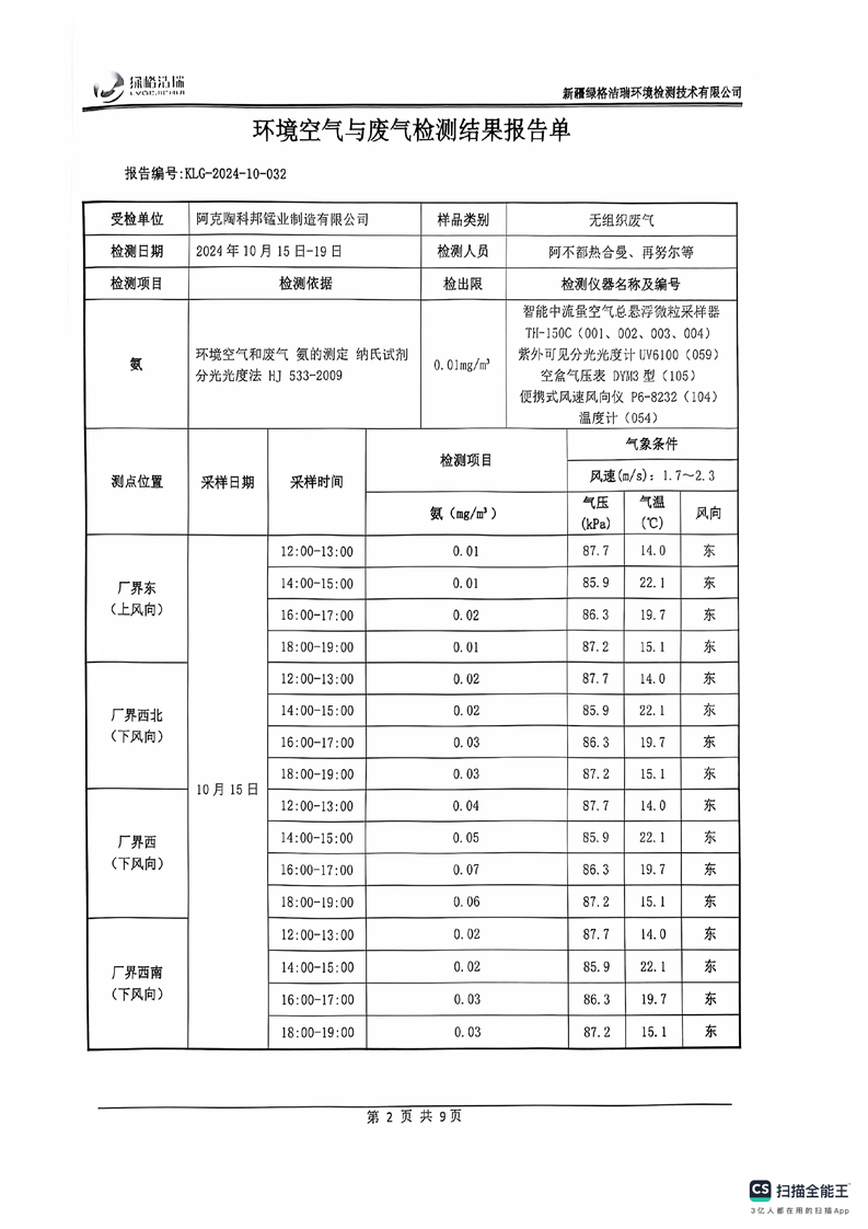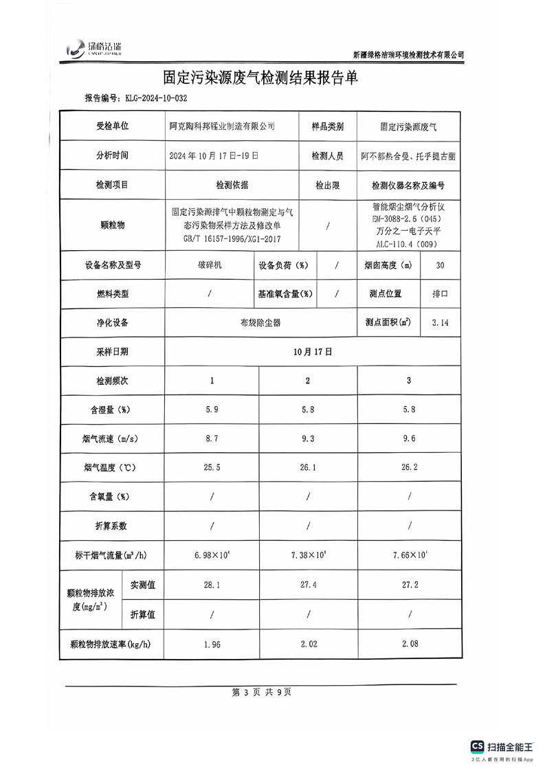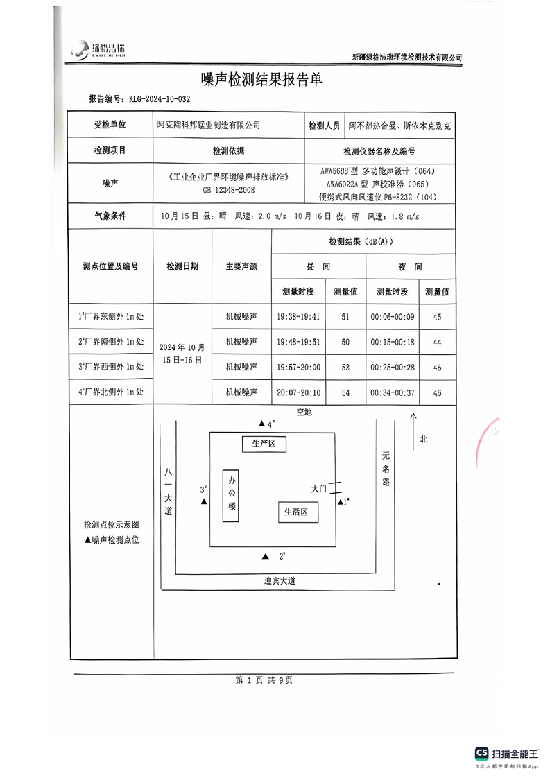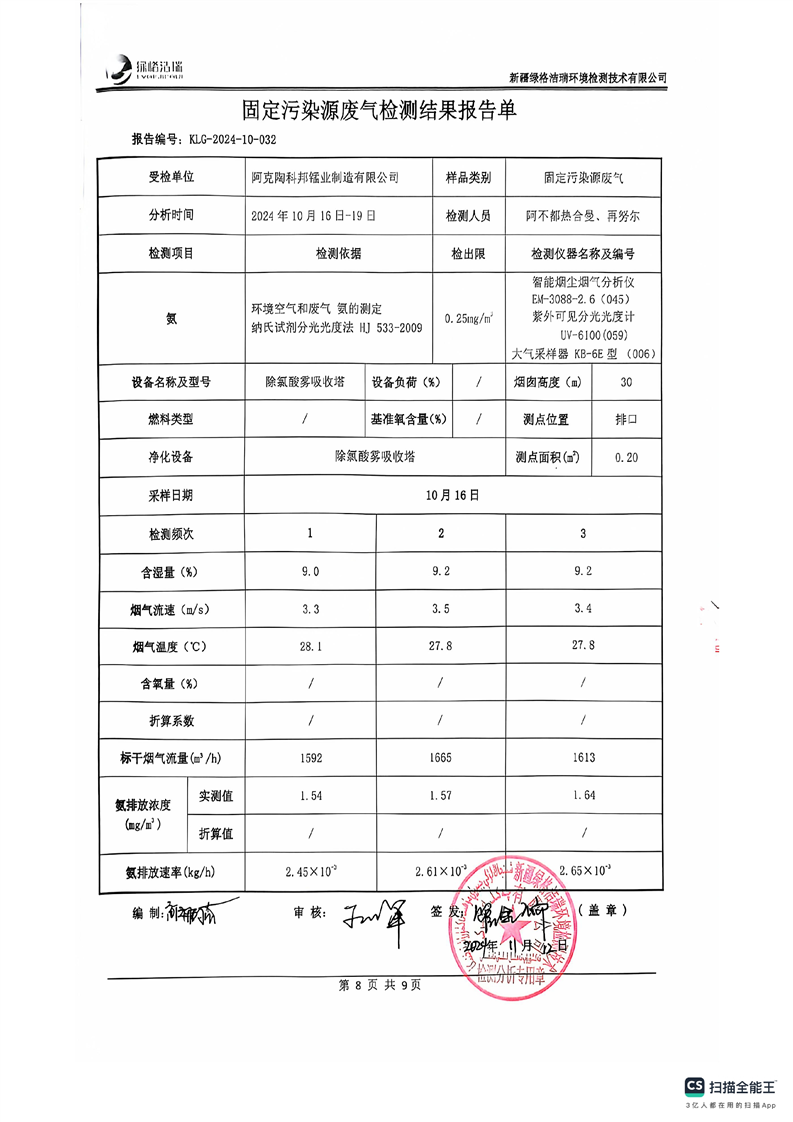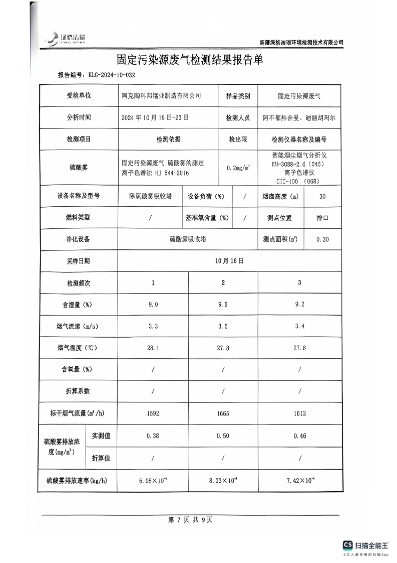 阿克陶科邦锰业制造有限公司2024年10月份污染源情况