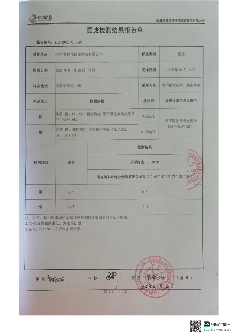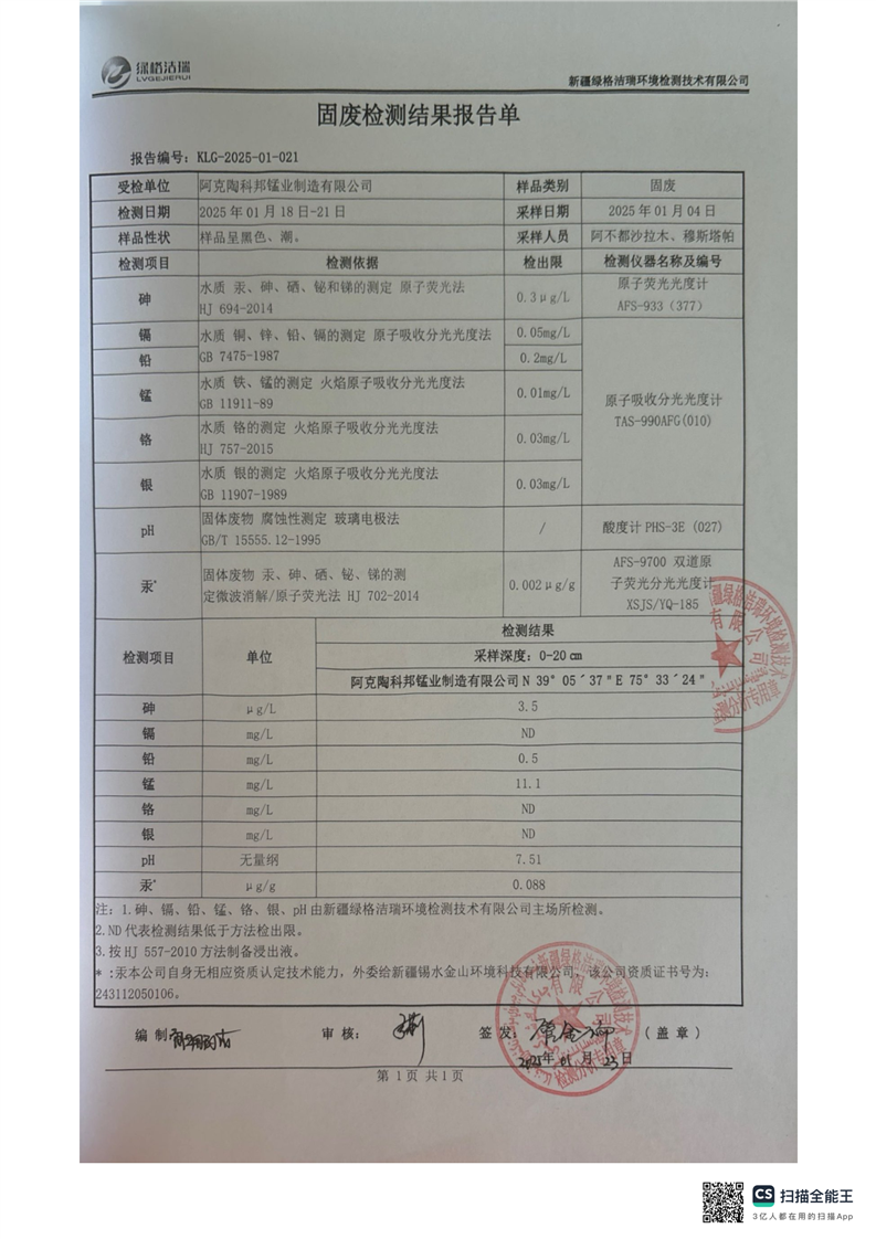 阿克陶科邦锰业制造有限公司2025年1月份污染源情况