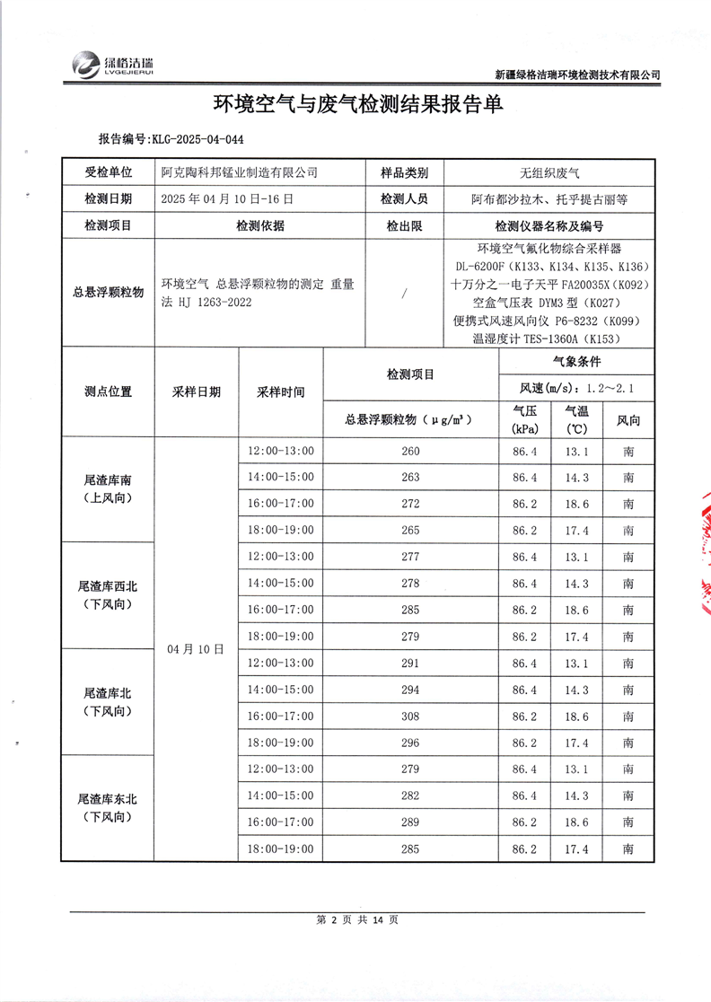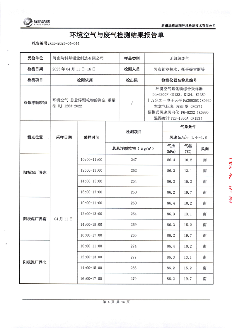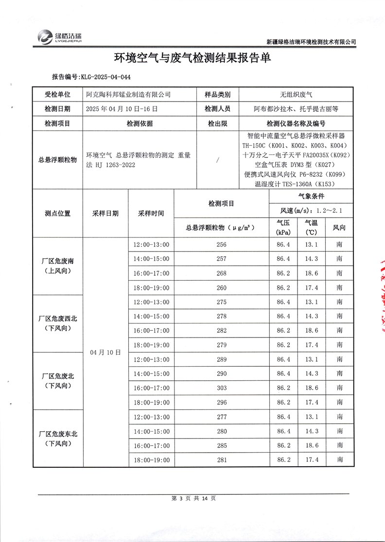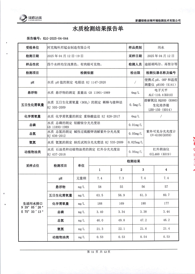 阿克陶科邦锰业制造有限公司2025年4月份污染源情况
