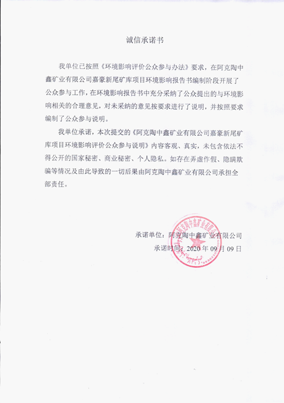 我单位于2020年3月委托乌鲁木齐市绿净天源环保技术咨询有限公司承担“阿克陶中鑫矿业有限公司嘉豪新尾矿库项目”环境影响评价工作。目前,该项目环境影响报告书及公众参与说明已编制完成,拟上报第一师阿拉尔市生态环境局进行审批,根据《中华人民共和国环境影响评价法》及《环境影响评价公众参与办法》(部令第4号)中的相关规定,现开展环境影响评价公众参与说明及报告书拟报批公示,以听取社会各界对该项目的环境影响及有关环境保护工作的意见和建议。