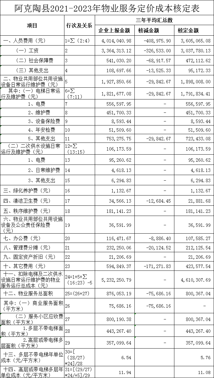 阿克陶县2021-2023年物业服务定价成本核定表