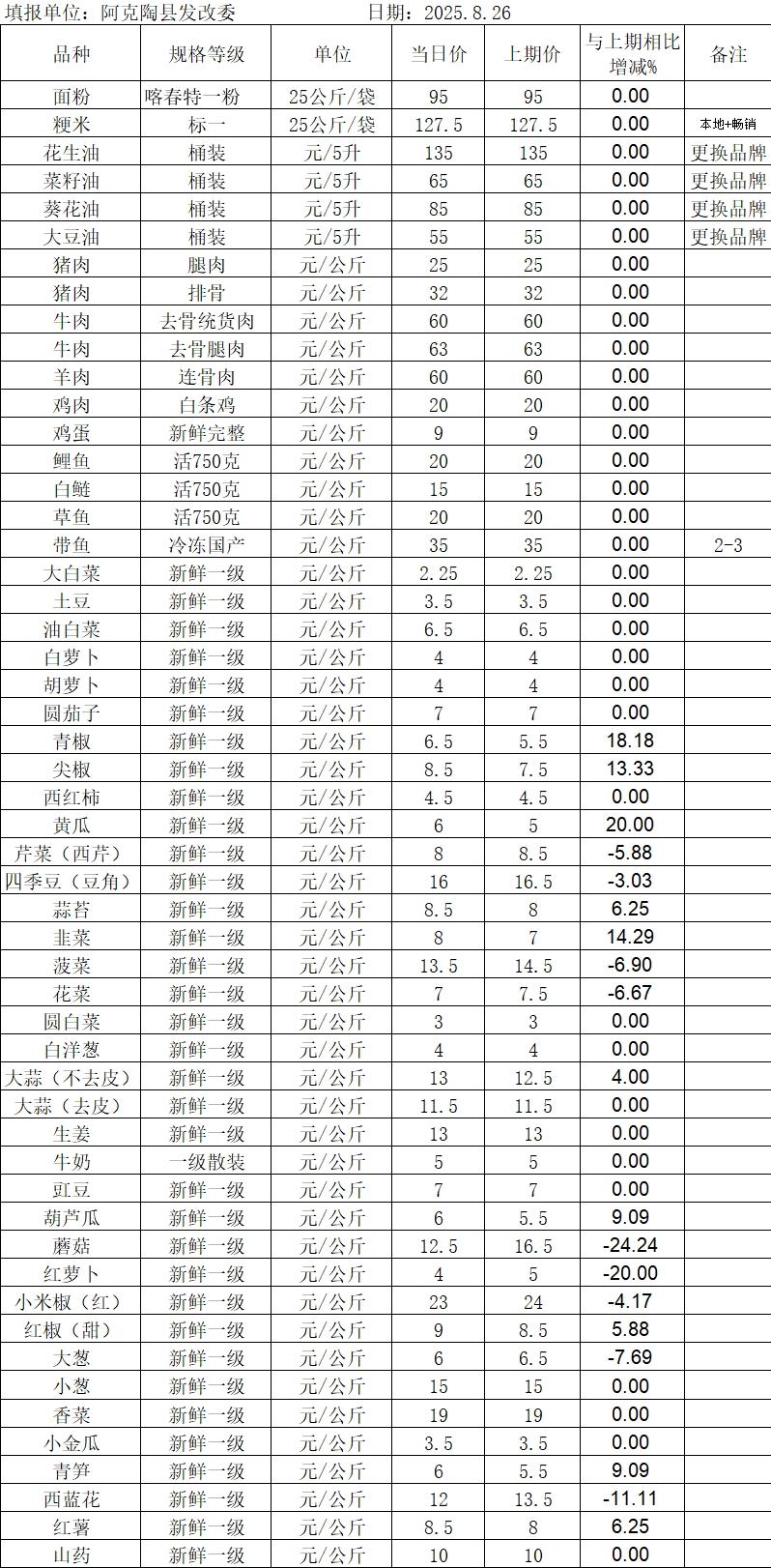 2025年8月26日阿克陶县肉、禽、蛋、菜、水产品价格监测表