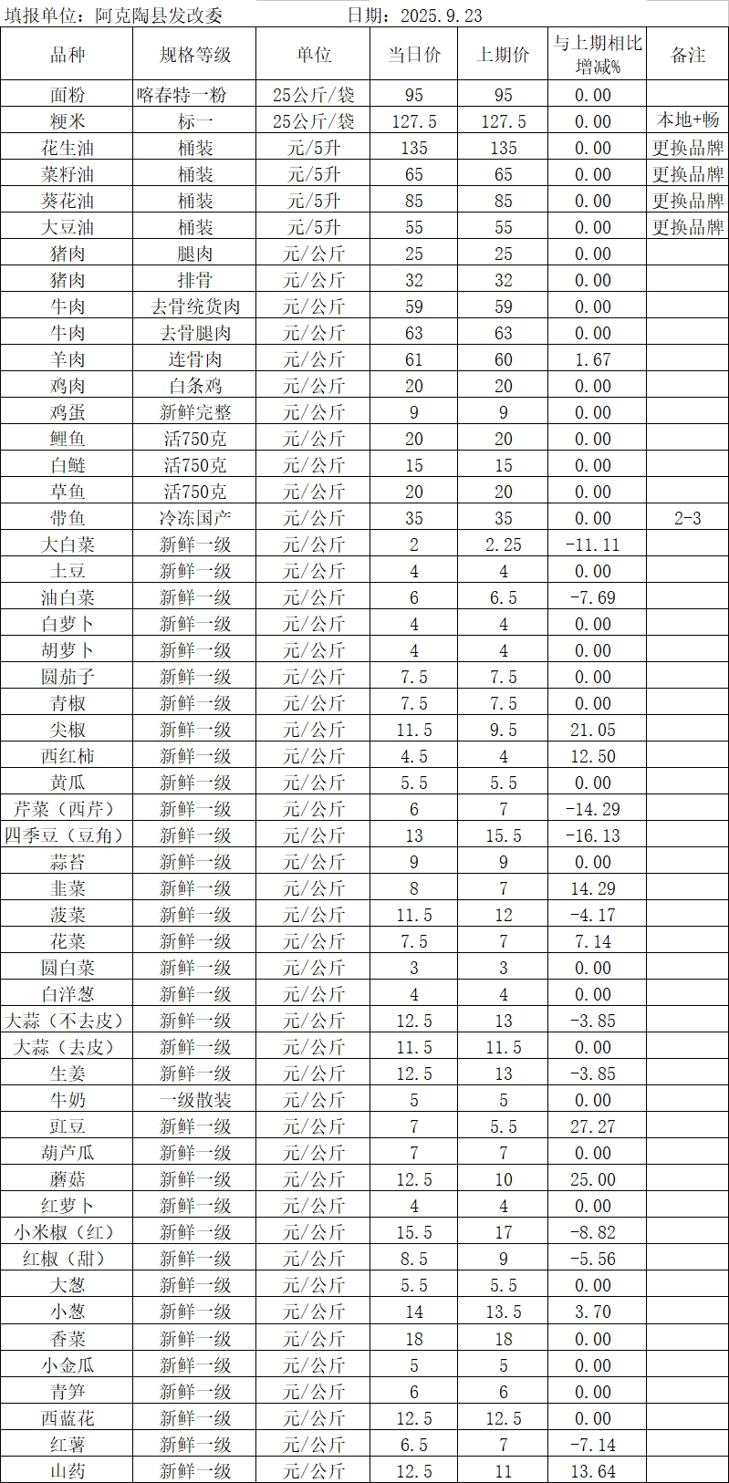 2025年9月23日阿克陶县肉、禽、蛋、菜、水产品价格监测表
