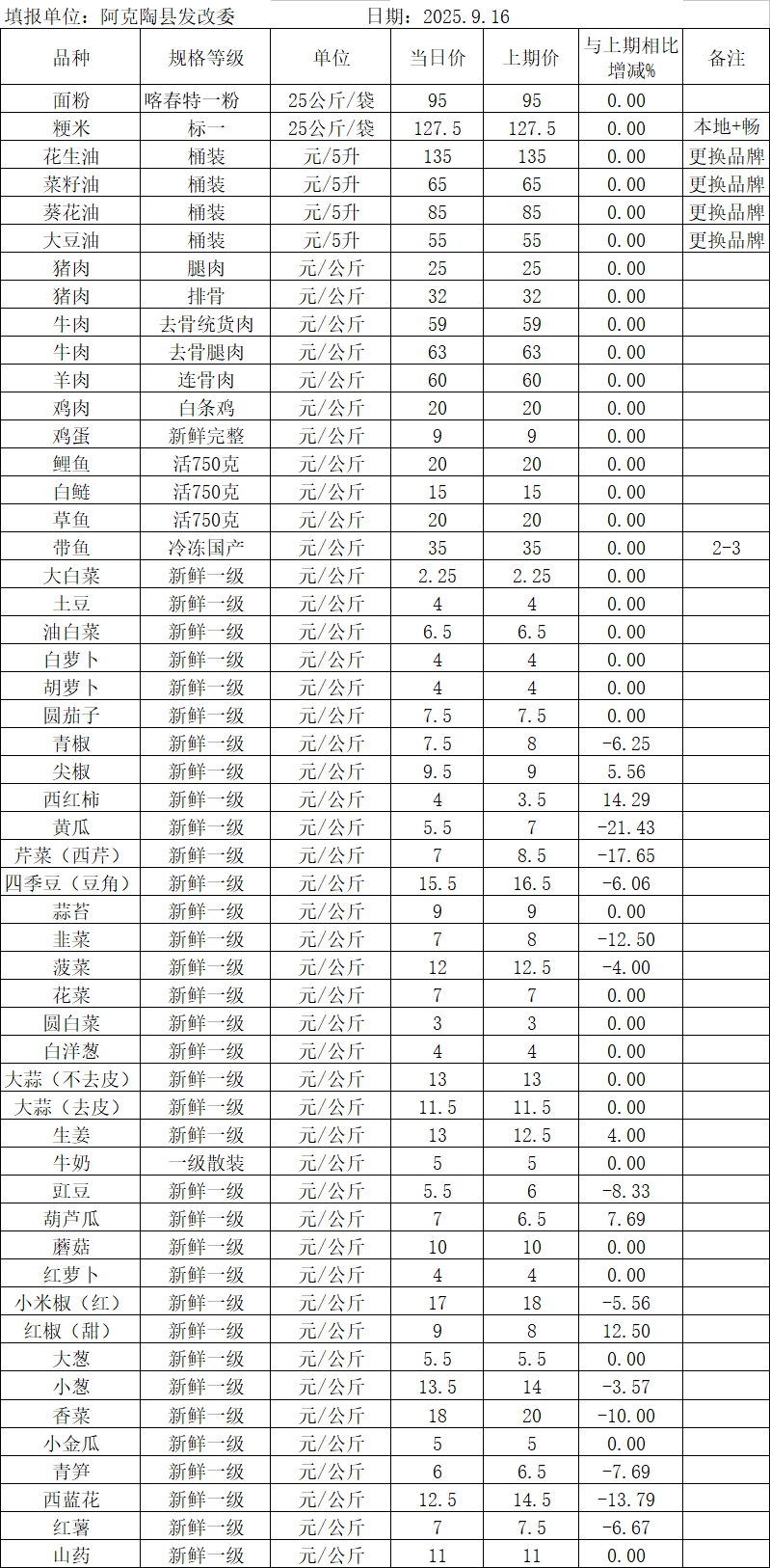 2025年9月16日阿克陶县肉、禽、蛋、菜、水产品价格监测表